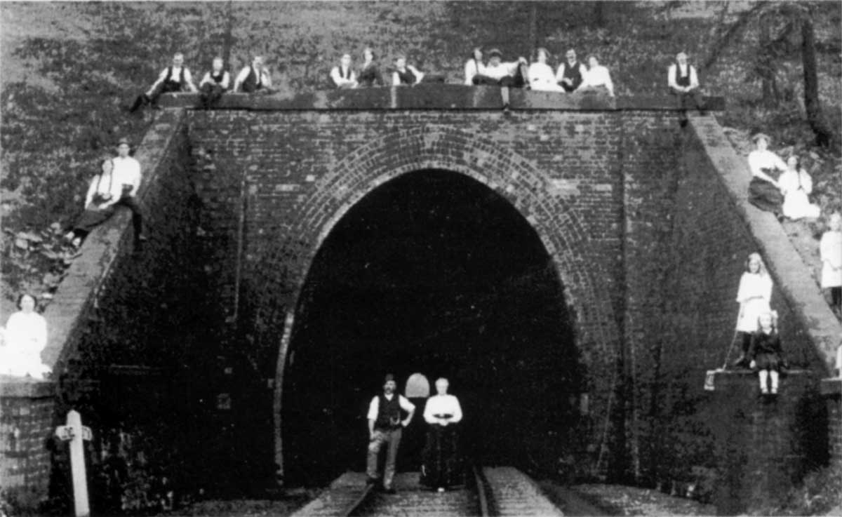 so that the whole route mileage amounted to rather more than 12 3/4 miles and the distance from Ticknall to the canal at Willesley was nearly 8 miles. At Ashby Old Parks, where the lines from Ticknall and Cloud Hill came together, there was a tunnel slightly over a quarter of a mile long which pierced a ridge to the east of Ashby and there were two shorter tunnels approaching Ticknall – the first about 50 yards long and the second, under the drive in Calke Park, 138 yards long. This second tunnel is only just below the ground level of the drive and has ventilators. Presumably, its purpose was to preserve the amenities of the estate. Beyond this tunnel, the line divides, the main section across the Arch to the quarries beyond and the other running downhill for about 300 yards to other quarries and to the lime kilns.